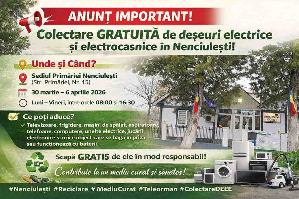 În comuna Nenciulești a început o campanie prin care locuitorii pot preda gratuit aparatele electrice și electronice vechi sau stricate. Inițiativa este organizată de Primărie, în parteneriat cu Asociația de Dezvoltare Intercomunitară Managementul Deșeurilor Teleorman, și se desfășoară între 30 martie și 6 aprilie, la sediul primăriei.
